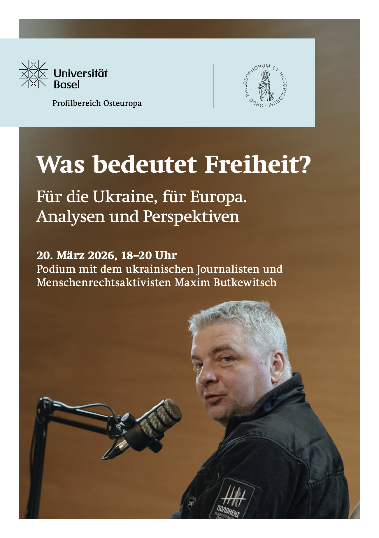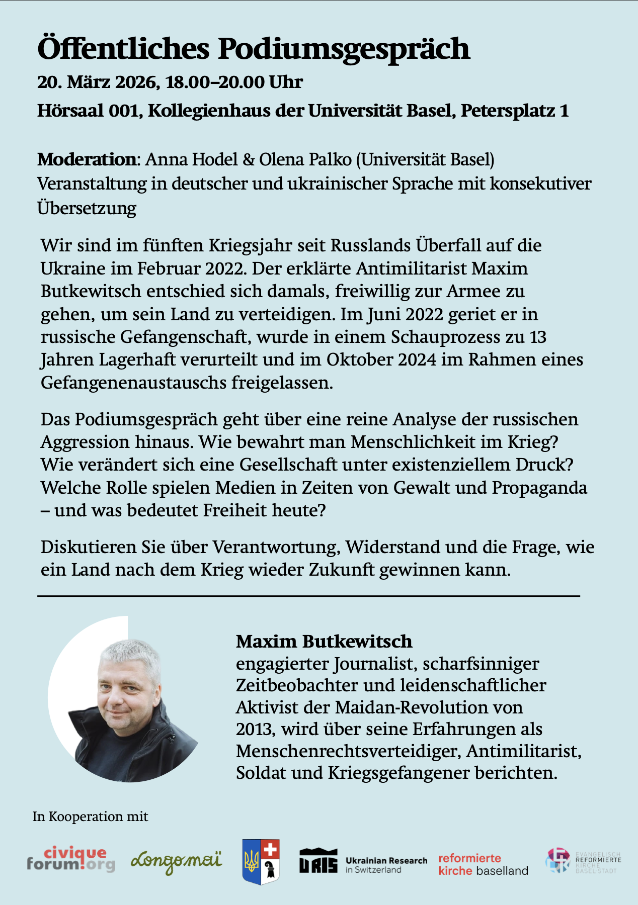 Am 20. März 2026 findet an der Universität Basel ein öffentliches Podiumsgespräch mit dem ukrainischen Journalisten und Menschenrechtsaktivisten Maxim Butkewitsch statt.