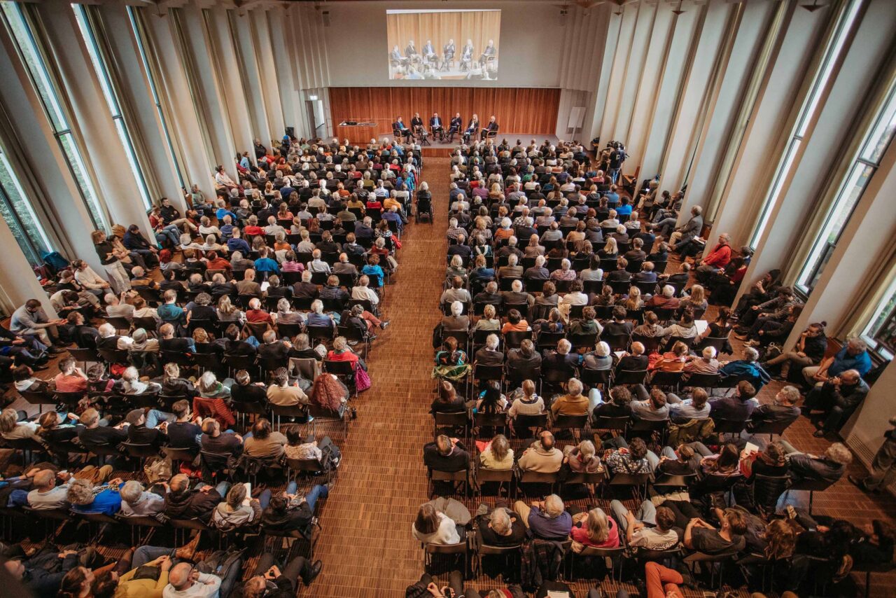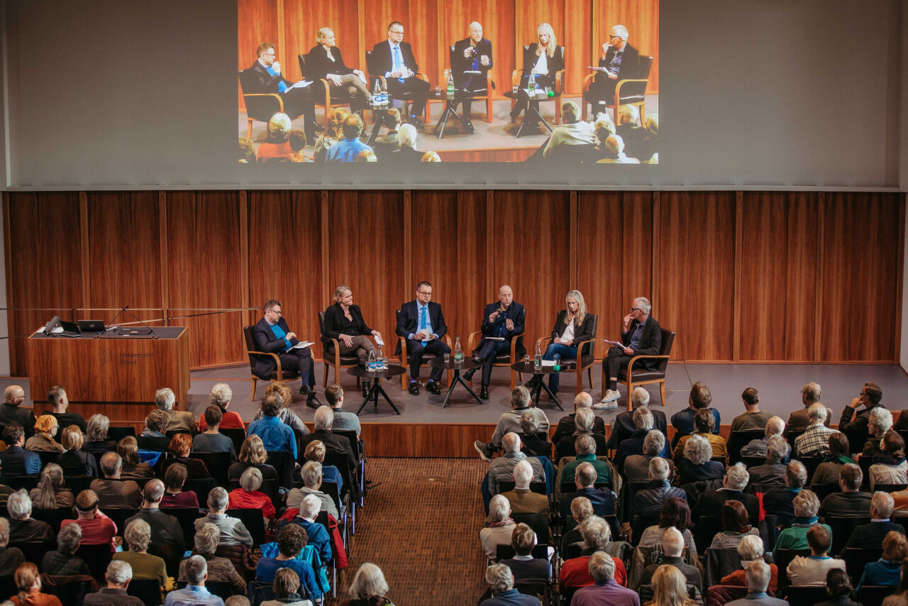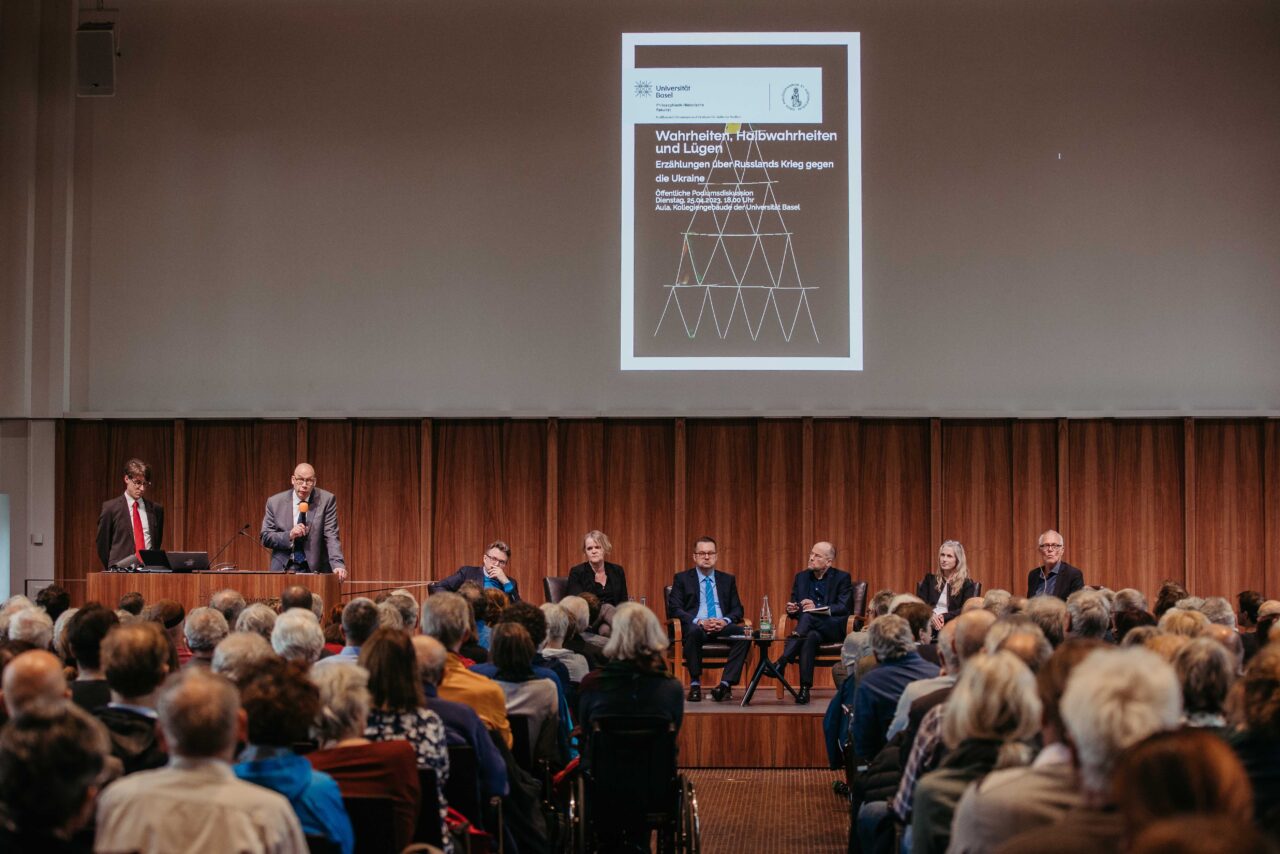 Auf dem öffentlichen Podium diskutierten drei Mitglieder der Philosophisch-Historischen Fakultät der Universität Basel, die sich intensiv mit den Strukturen solcher Erzählungen und deren Publikum bzw. mit der Geschichte der Ukraine und Russlands beschäftigt haben, mit zwei Gästen: Christoph Keller (Reporter und Moderator) führt das Gespräch mit dem Osteuropa-Historiker F. Benjamin Schenk (Leiter Ukrainian Research in Switzerland), der Germanistin Nicola Gess («Halbwahrheiten»), dem Soziologen Oliver Nachtwey («Gekränkte Freiheit»), der Slavistin Sylvia Sasse von der Universität Zürch («Verkehrungen ins Gegenteil») und Sebastian Ramspeck, internationaler Korrespondent des SRF.